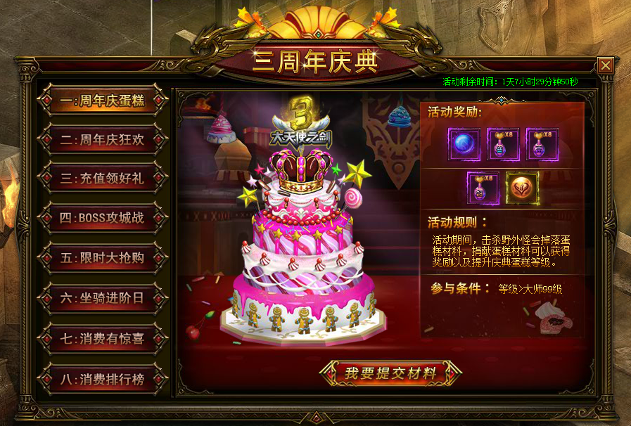 三周年庆典 活动时间:2017.06.08 00:00:00~2017.06.09 23:59:59 活动一 周年庆蛋糕 活动期间击杀野外怪物会掉落蛋糕材料,捐献蛋糕材料可以获得奖励以及提升庆典蛋糕等级。参与条件:大师99级以上玩家 温馨提示: ...