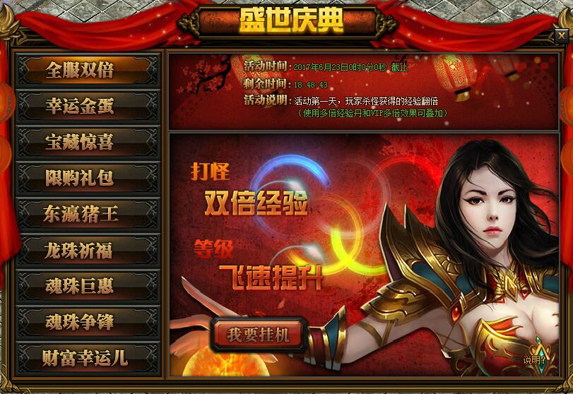 盛世庆典活动时间:6月22日-6月24日活动一:全服双倍活动详情:活动期间玩家打怪挂机可获得双倍经验加成,此效果与VIP加成及经验卷轴不冲突,让您等级飞速提升。 ...
