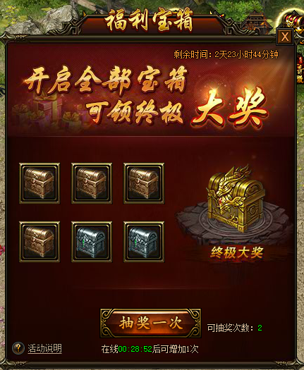 福利宝箱,海量奖励等你拿! 1. 福利宝箱活动时间:2017年7月25日0点——7月27日23:59活动期间,每在线一段时间,即可免费打开铜箱子,每充值一定数量元宝,即可免费打开银箱子,铜箱子和银箱子全部被打开后,还可额 ...