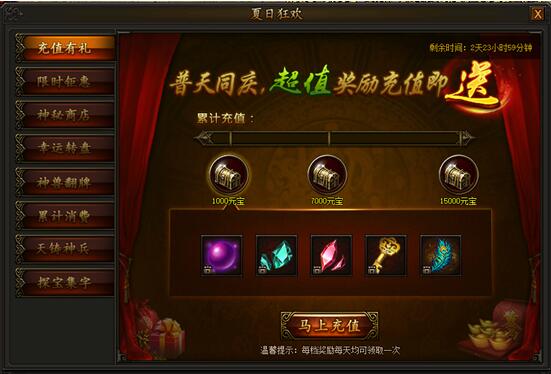 夏日狂欢,激情狂欢! 1. 充值有礼活动时间:2017年8月6日0点——8月8日23:59活动期间,充值元宝即可领取三档丰厚奖励,每天均可领取一次,不容错过! ...