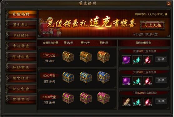 霸业福利,海量材料送不停! 1. 充值福利活动时间:2017年8月17日0点——8月21日23:59活动期间,充值满一定数量元宝,即可领取每日充值元宝对应档奖励,每档奖励每天均可领取一次,同时累计充值元宝满一定数量且达到 ...