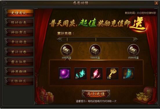 感恩回馈,豪礼相赠! 1. 充值有礼活动时间:2017年9月6日0点——9月8日23:59活动期间,充值元宝即可领取三档丰厚奖励,每天均可领取一次,不容错过! ...