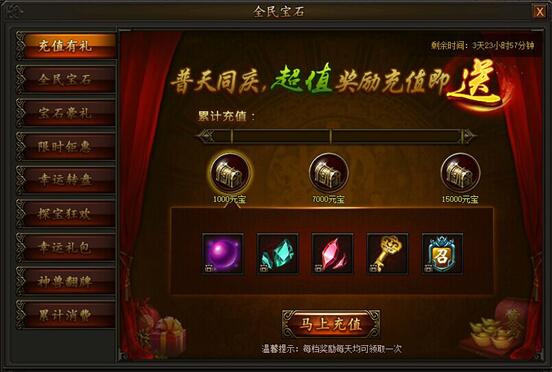 宝石竞技,豪礼相赠! 1. 充值有礼活动时间:2017年9月17日0点——9月20日23:59活动期间,充值元宝即可领取三档丰厚奖励,每天均可领取一次,不容错过! ...