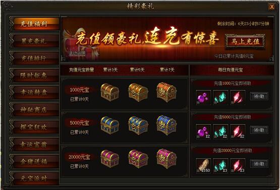 精彩豪礼,海量馈赠! 1. 充值福利活动时间:2017年9月21日0点——9月27日23:59活动期间,充值满一定数量元宝,即可领取每日充值元宝对应档奖励,每档奖励每天均可领取一次,同时累计充值元宝满一定数量且达到要求天 ...