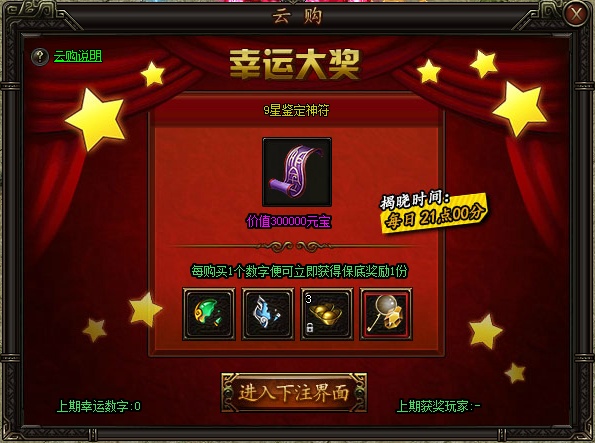 全民云购计划 九星鉴定神符花落谁家 活动时间:10月28日-10月30日云购奖品:九星鉴定神符第一条鉴定属性:HP上限【9星】第二条鉴定属性:攻击上限【9星】(使用神符附加属性时,道士为道攻上限、法师为魔攻上限,战 ...