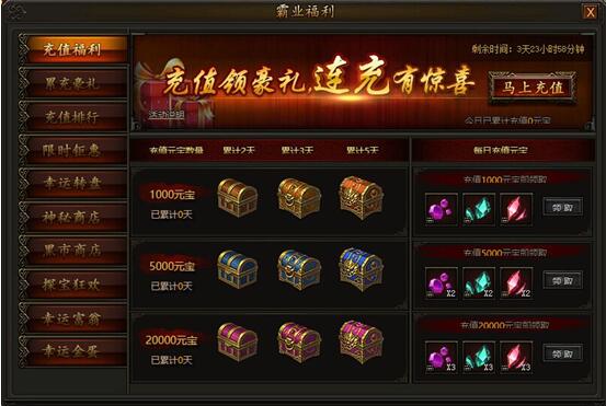 霸业福利,海量材料送不停! 1. 充值福利活动时间:2017年11月15日0点——11月19日23:59活动期间,充值满一定数量元宝,即可领取每日充值元宝对应档奖励,每档奖励每天均可领取一次,同时累计充值元宝满一定数量且达 ...