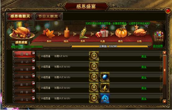 感恩盛宴一、感恩嗨翻天 活动时间:2017.11.2200:00:00~2017.11.23 23:59:59 活动内容: 1、活动期间,完成各种任务可以获得相应的感恩值和道具奖励; 2、积累获得的感恩值越多,可以领取更多的感恩宴品开启丰厚大奖 ...