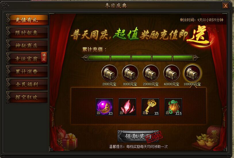 《传奇霸业》11月25日冬日庆典,海量馈赠! 1. 充值有礼活动时间:2017年11月25日0点——11月29日23:59活动期间,充值元宝即可领取五档丰厚奖励,每天均可领取一次,不容错过! ...