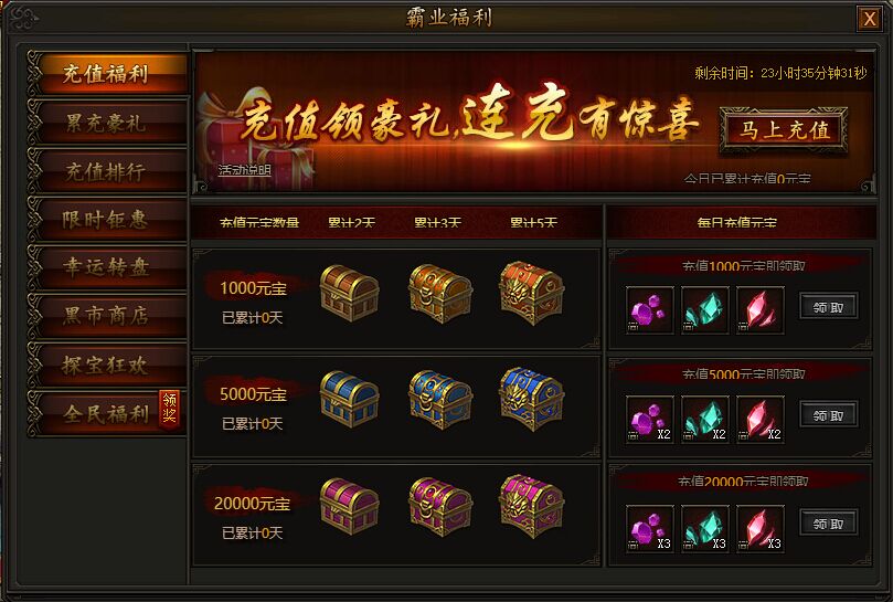 《传奇霸业》12月1日霸业福利,豪礼相赠! 1. 充值福利活动时间:2017年12月1日0点——12月5日23:59活动期间,充值满一定数量元宝,即可领取每日充值元宝对应档奖励,每档奖励每天均可领取一次,同时累计充值元宝满 ...