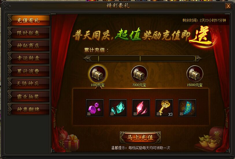 《传奇霸业》12月6日精彩豪礼,海量材料送不停! 1. 充值有礼活动时间:2017年12月6日0点——12月8日23:59活动期间,充值元宝即可领取三档丰厚奖励,每天均可领取一次,不容错过! ...