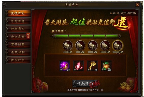 冬日庆典,海量馈赠! 1. 充值有礼活动时间:2017年12月14日0点——12月16日23:59活动期间,充值元宝即可领取五档丰厚奖励,每天均可领取一次,不容错过! ...