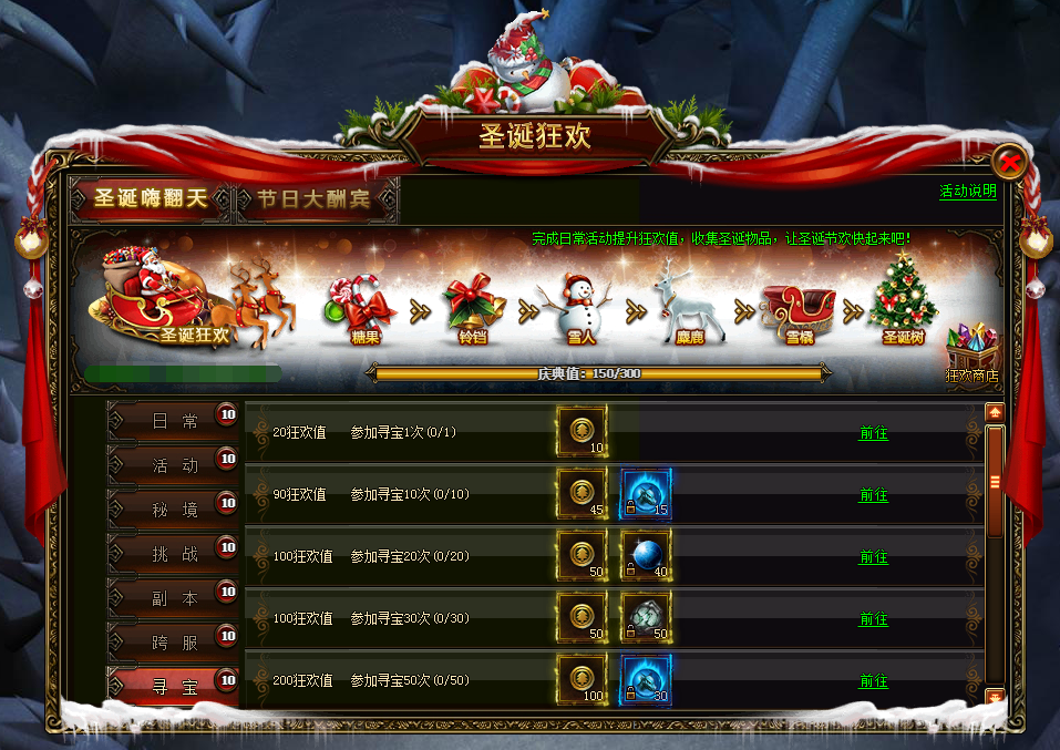 圣诞狂欢(大酬宾) 叮叮当,叮叮当,铃儿响叮当~欢乐满满的圣诞节又到了,让我们一起来准备狂欢吧! 圣诞嗨翻天 活动时间:2017年12月25日00:00:00~2017年12月26日23:59:59 活动期间,完成各种任务可以获得狂 ...