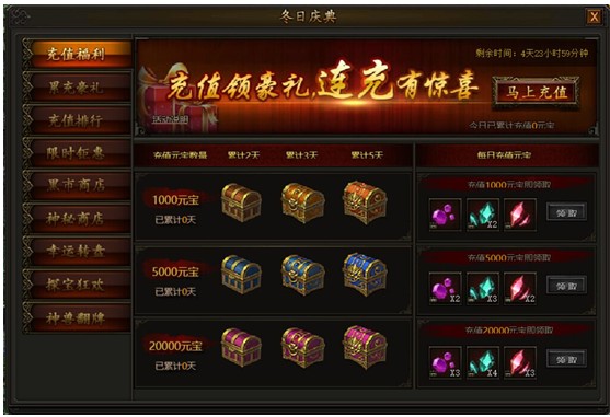 冬日庆典,海量材料送不停! 1. 充值福利活动时间:2018年1月15日0点——1月19日23:59活动期间,充值满一定数量元宝,即可领取每日充值元宝对应档奖励,每档奖励每天均可领取一次,同时累计充值元宝满一定数量且达到 ...