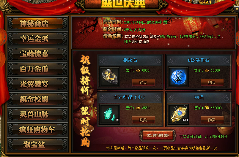 盛世庆典活动时间:2月1日-2月3日活动一:神秘商店活动详情:活动期间神秘商店内会推出极品道具并以超低的价格供玩家购买,本次新增6级准确石、6级暴击石、极品坐骑、金刚石等珍惜道具,玩家可直接消耗元宝、金币、 ...