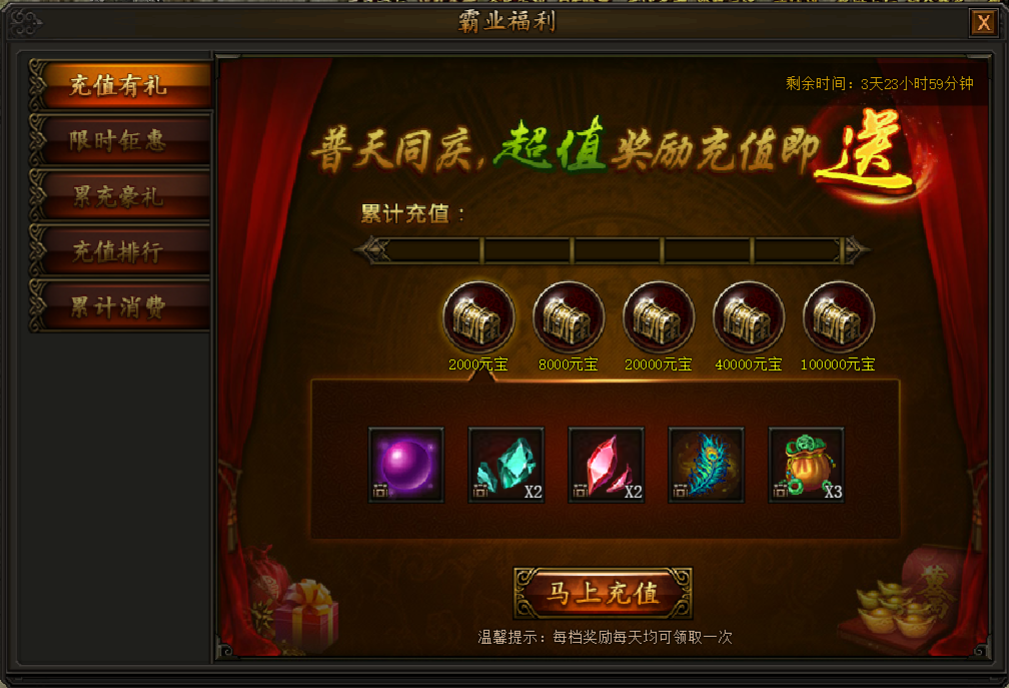 霸业福利,豪礼相赠! 1. 充值有礼活动时间:2018年2月24日0点——2月27日23:59活动期间,充值元宝即可领取五档丰厚奖励,每天均可领取一次,不容错过! ...
