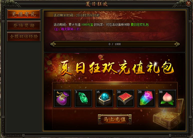 夏日狂欢 活动一、每日首充有礼活动时间:2月28日-3月2日活动范围:全服活动内容:活动期间累计充值1000元宝,即可领取夏日狂欢礼包,每天只能领取一次活动奖励:紫色符文包*1,灵石精华(中)*3,坐骑丹*15,珍贵丝 ...
