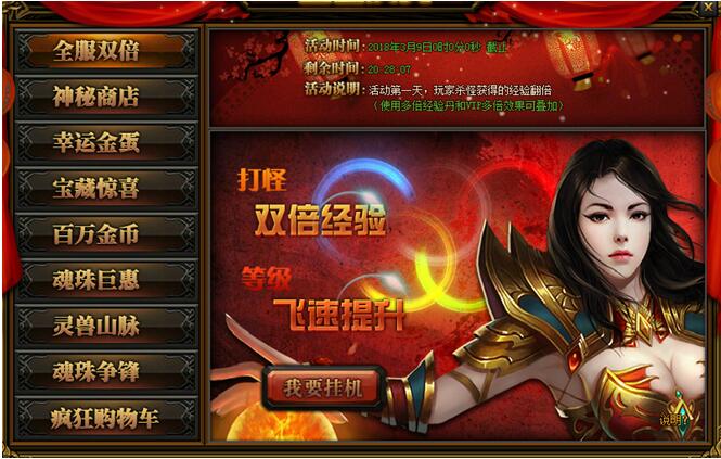 盛世庆典活动时间:3月8日-3月10日活动一:全服双倍活动详情:活动期间玩家打怪挂机可获得双倍经验加成 ...
