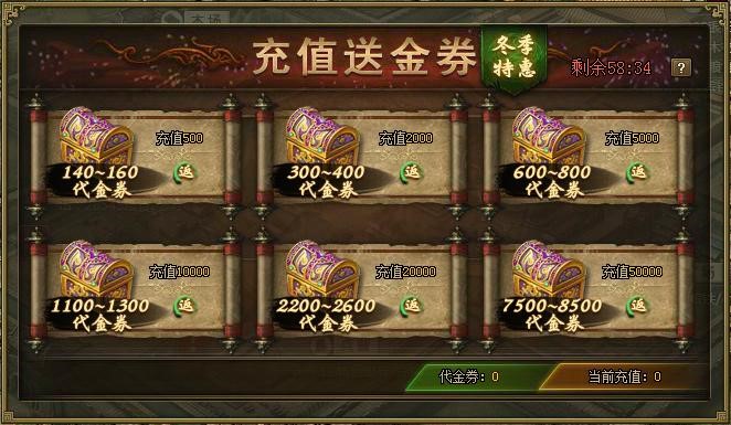 ● 活动公告 活动一:冬季特惠,充值送金券!活动范围:2月22日(含)之前已开所有服活动时间:3月14日0点至3月15日24点活动内容:活动期间,满足下列充值额度就能获得代金券奖励。代金券可 ...