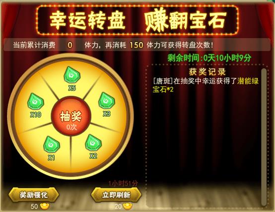 《葫芦娃》3月20日幸运转盘,赚翻宝石 活动范围:3月8日(含)之前已开所有服活动时间:3月20日5:00至3月22日5:00活动内容:活动期间,消耗体力可获得转盘抽奖次数进行抽奖,抽奖可获得潜能宝石。 ※ 活动玩法1. 消 ...