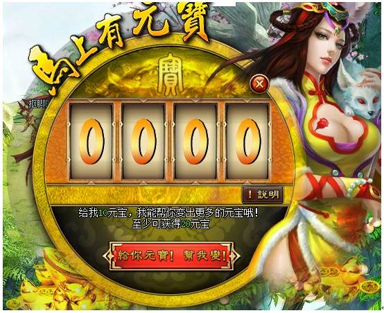 马上有元宝一、活动开启主角达到20级,即可开启马上有元宝的活动; 二、玩法规则只要投入指定数量的元宝,玉面狐狸就能为你变出更多的元宝,这种只赚不赔的买卖,你还在等什么呢,不过要注意一下:①需要先消耗元宝 ...