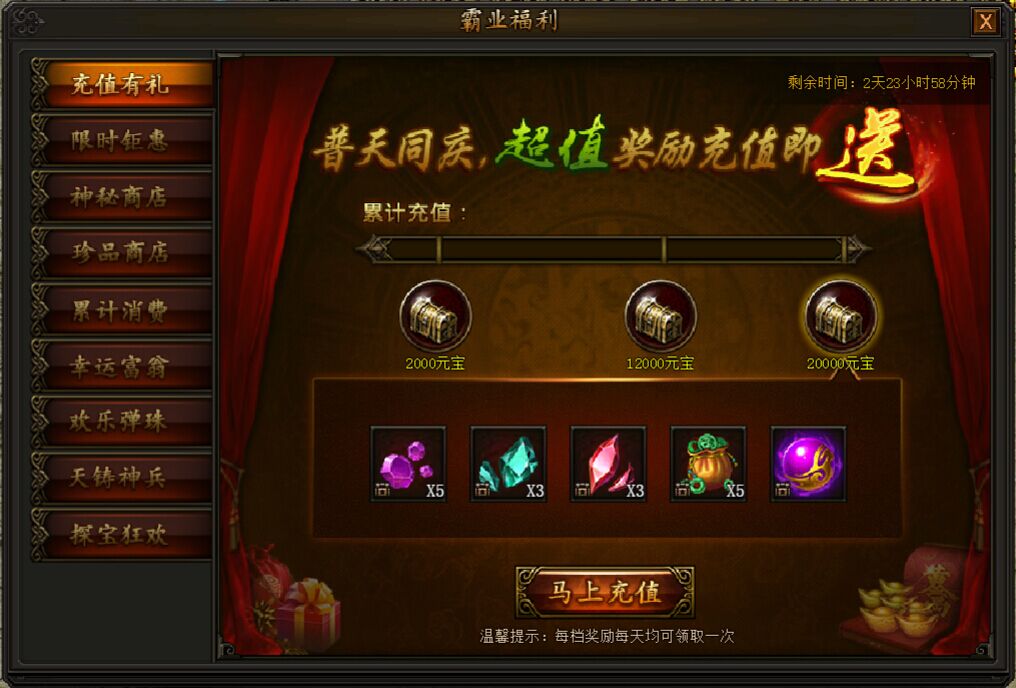 霸业福利,豪礼相赠! 1. 充值有礼活动时间:2018年3月28日0点——3月30日23:59活动期间,充值元宝即可领取三档丰厚奖励,每天均可领取一次,不容错过! ...