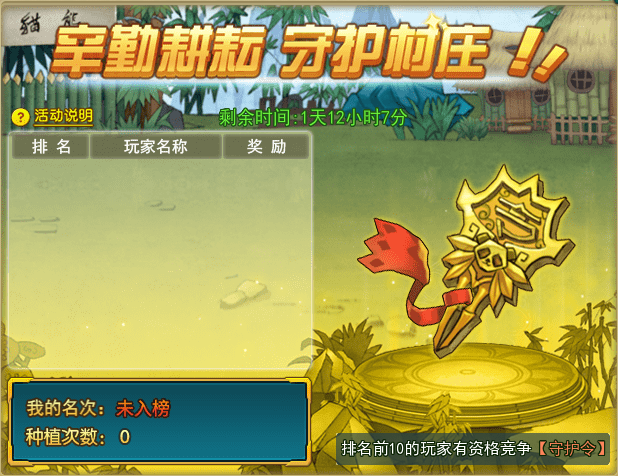 辛勤耕耘,守护村庄 活动范围:3月17日(含)之前已开所有服活动时间:3月29日5:00至3月31日5:00活动内容:活动期间,在农场内收获农作物可获得积分,积分排名前1000名可获得银币奖励,前10名有几率获得【村庄守护令 ...