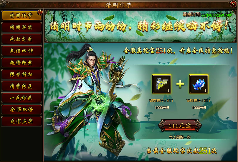 本帖最后由 街角DE幸福 于 2018-7-23 09:42 编辑 《攻沙》清明佳节活动 【活动时间】4月5日0:00-23:59【活动范围】开服>7天的服务器 活动一、超值福利全民狂欢【活动内容】活动期间,全服总挖宝次数超过251次, ...