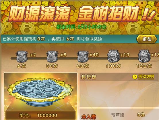 《葫芦娃》4月6日金树招财,财源滚滚 活动范围:3月25日(含)之前已开所有服活动时间:4月6日5:00至4月8日5:00活动内容:活动期间,使用摇钱树达到指定次数时,可获得福袋。 ※ 活动玩法1. 使用摇钱树达到指定次数 ...