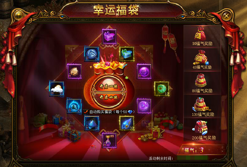 幸运福袋【活动时间】2018/4/14 00:00:00~23:59:00【活动规则】• 玩家可消耗钻石购买福袋,每个福袋50钻石,开启福袋可获得道具奖励!将有机会获得:灵宠经验丹、夜魅晶魂、巴尔德尔 ...