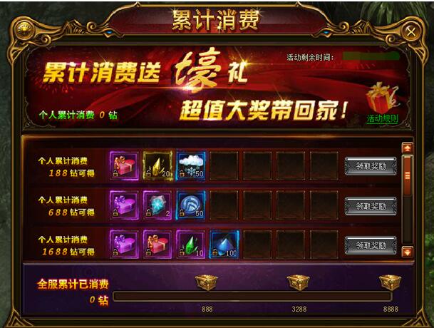 累计消费 活动时间:2018.4.15 00:00:00~2018.4.17 23:59:59活动范围:大师1级以上玩家 活动内容:1、活动期间个人只要每消费到一定额度即可领取一份丰厚奖励! 2、活动期间全服总消费每达到一定额度后,所有人均可 ...