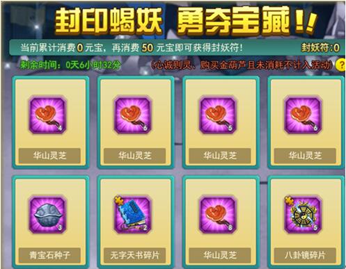 封印蝎妖,勇夺宝藏 活动范围:4月17日(含)之前已开所有服活动时间:4月28日5:00至4月30日5:00活动内容:活动期间,消耗元宝可获得封妖符,使用封妖符封印蝎妖可获得道具奖励。 ※ 活动玩法1. 活动期间,消耗元宝 ...