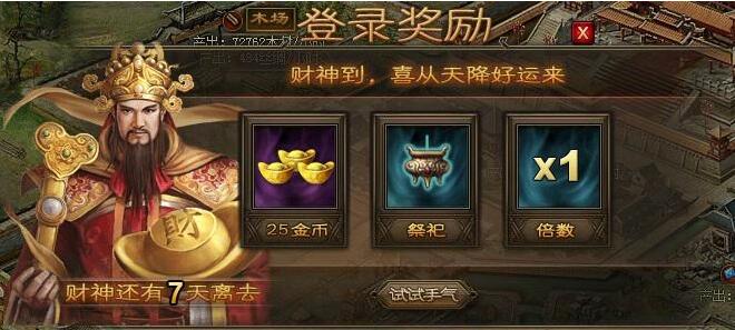 财神降临庆武斗,撞钟祈福剿蛮族 活动一:财神到,喜从天降好运来! 活动范围:4月19日(含)之前已开所有服 活动时间:5月9日0点至5月10日24点 活动内容:活动期间,满足下列充值额度就能获得额外奖励及buff。充值 ...