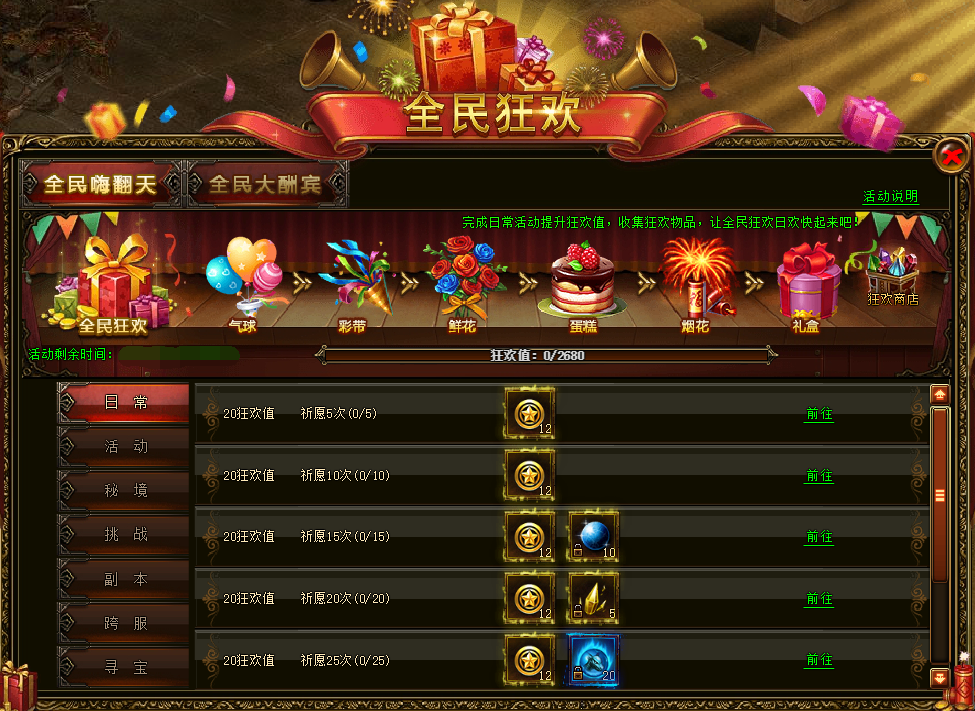 全民狂欢完成日常活动提升狂欢值,收集狂欢币,让狂欢节欢快起来吧!活动时间:2018/5/24 00:00:00-2018/5/2523:59:59活动内容:一、【全民嗨翻天】1、 活动期间,完成各种任务可以获得相应的狂欢值和道 ...