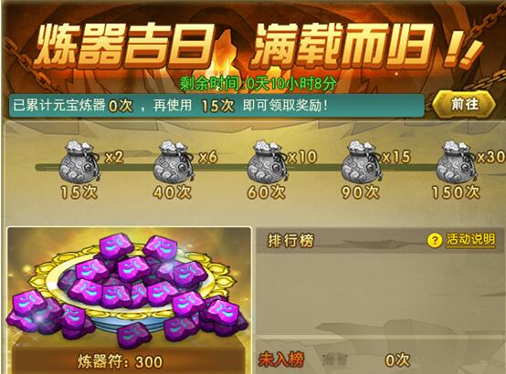 炼器吉日,满载而归 活动范围:5月14日(含)之前已开所有服活动时间:5月25日5:00至5月27日5:00活动内容:活动期间,使用元宝炼器达到指定次数时,可获得炼器福袋奖励。 ※ 活动玩法1.使用元宝炼器达到指定次数时, ...