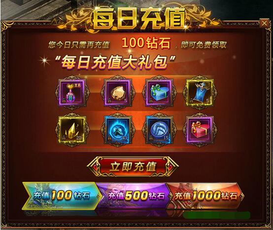 每日充值 活动时间:2018.6.14 00:00:00 - 2018.6.16 23:59:59活动范围:大师200级以上的玩家活动内容:活动期间,每日累计充值分别达到100钻、500钻、1000钻,均可领取丰厚奖励; 充值100钻石可获得:8倍经验药水( ...