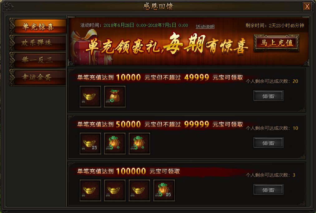 感恩回馈,豪礼相赠! 1. 单充惊喜活动时间:2018年6月28日0点——6月30日23:59活动期间,单笔充值元宝数量满足对应条件,即可领取超值反馈,每档奖励均有个人领取次数限制! ...