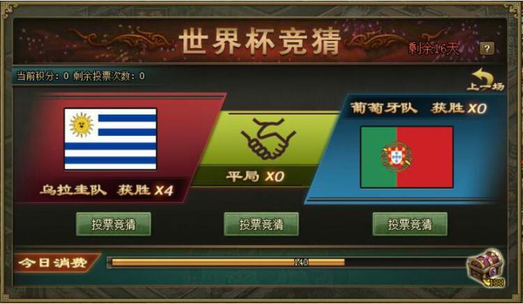 为世界杯呐喊助威,竞猜赢绝版宝物! 活动范围:6月29日(含)之前已开服务器 活动时间:6月29日20:00至7月16日12:00 参与条件:已开启“世界”的玩家 活动内容:消耗元宝获得竞猜机会,猜对可累计积分,积分可兑换 ...