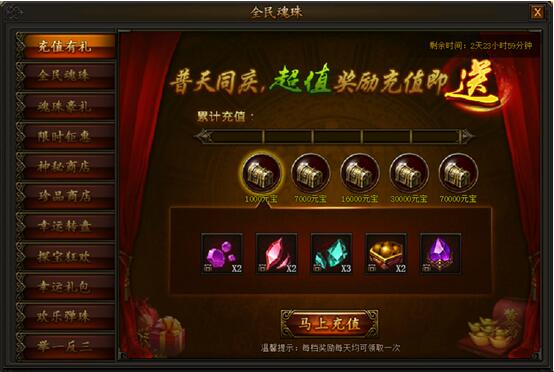 魂珠竞技,海量豪礼等你来! 1. 充值有礼活动时间:2018年7月9日0点——7月11日23:59活动期间,充值元宝即可领取五档丰厚奖励,每天均可领取一次,不容错过! ...