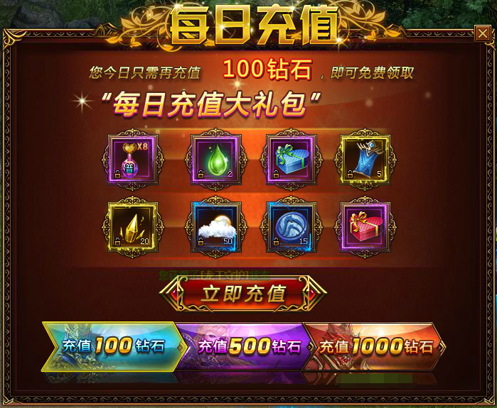 每日充值 活动时间:2018.8.4 00:00:00 - 2018.8.6 23:59:59活动范围:大师200级以上的玩家活动内容:活动期间,每日累计充值分别达到100钻、500钻、1000钻,均可领取丰厚奖励; 充值100钻石可获得:正义宝珠精华*2 ...