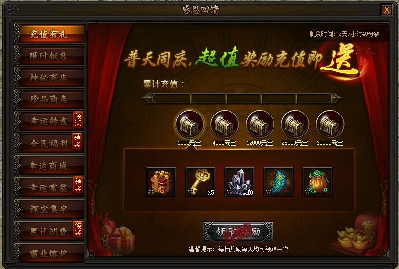 感恩回馈,豪礼相赠! 1. 充值有礼活动时间:2018年8月21日0点——8月24日23:59活动期间,充值元宝即可领取五档丰厚奖励,每天均可领取一次,不容错过! ...