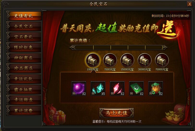 宝石竞技,豪礼相赠! 1. 充值有礼活动时间:2018年8月28日0点——8月30日23:59活动期间,充值元宝即可领取五档丰厚奖励,每天均可领取一次,不容错过! ...