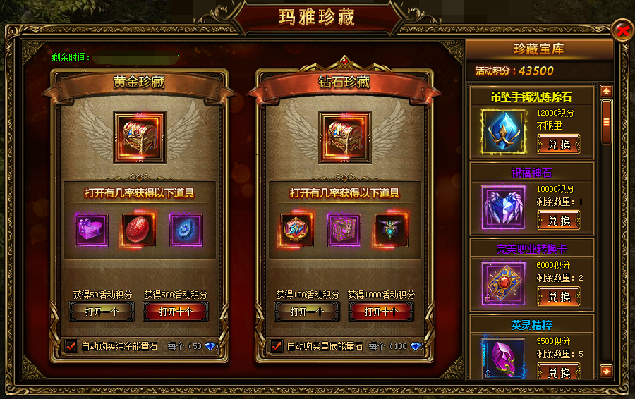 玛雅珍藏玛雅珍藏来袭,珍贵宝藏等你来发掘! 活动时间:2018.9.14 00:00:00-23:59:59 活动范围:大师1级以上的玩家 活动规则:(1)玩家可以购买能量石打开珍藏,获得各种珍稀道具,分为黄金珍藏和钻石珍藏。 (2) ...