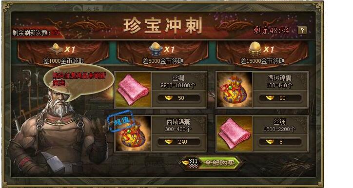 珍宝冲刺圆珍梦、过关斩将夺佳酿 活动一:珍宝冲刺,圆你十珍梦! 活动范围:8月28日(含)之前已开所有服 活动时间:9月17日0点至24点 参与条件:已开启丝绸之路的玩家 活动内容:活动期间,在活动界面可以购买丝 ...
