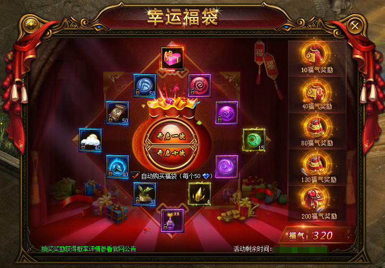 幸运福袋【活动时间】2018/9/2900:00:00~23:59:00【活动规则】• 玩家可消耗钻石购买福袋,每个福袋50钻石,开启福袋可获得道具奖励!将有机会获得:极品福袋如意宝箱(打开可选择以下 ...