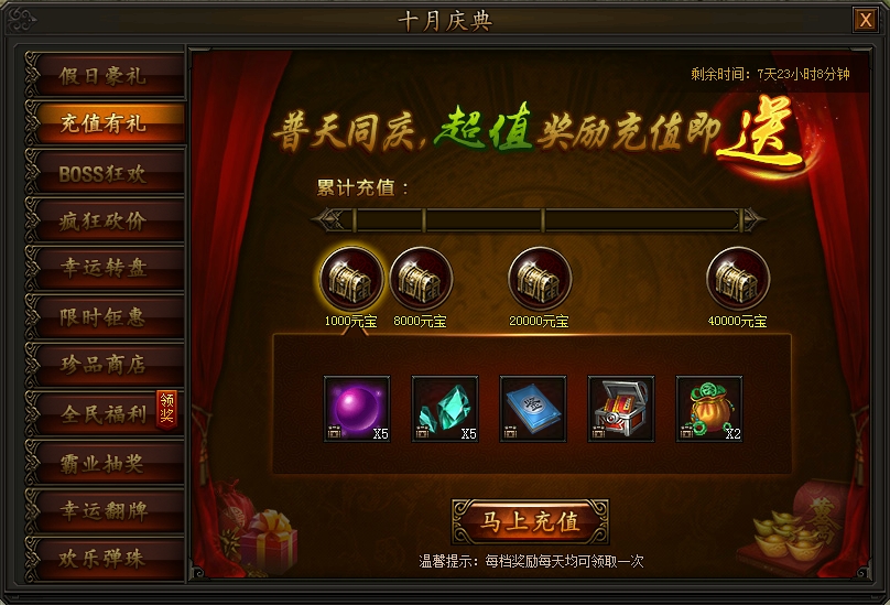 十月庆典,海量豪礼送不停! 1. 充值有礼活动时间:2018年9月29日0点——10月7日23:59活动期间,充值元宝即可领取四档丰厚奖励,每天均可领取一次,不容错过! ...