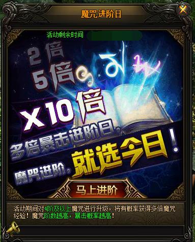 《大天使之剑》10月7日魔咒进阶日 活动时间:2018.10.7 00:00:00-2018.10.8 23:59:59活动范围:一转大师250级以上玩家活动内容:活动期间对4阶及以上的魔咒进行升级,将有概率获得多倍魔咒经验。魔咒阶数越高,暴击 ...