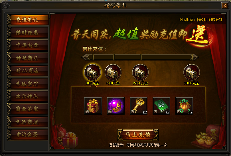 精彩豪礼,海量材料送不停! 1. 充值有礼活动时间:2018年10月8日0点——10月11日23:59活动期间,充值元宝即可领取四档丰厚奖励,每天均可领取一次,不容错过! ...