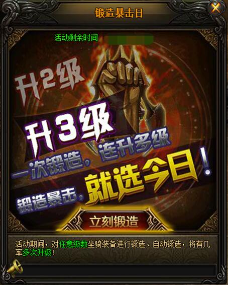 锻造暴击日 活动时间:2018.10.1200:00:00~23:59:59 活动内容:活动期间,对任意级数坐骑装备进行锻造、自动锻造,将有几率多次升级!大大节省锻造材料,抓紧机会啦! ...