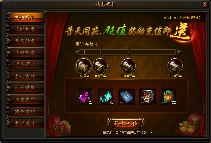 精彩豪礼,海量材料送不停! 1. 充值有礼活动时间:2018年10月16日0点——10月17日23:59活动期间,充值元宝即可领取四档丰厚奖励,每天均可领取一次,不容错过! ...