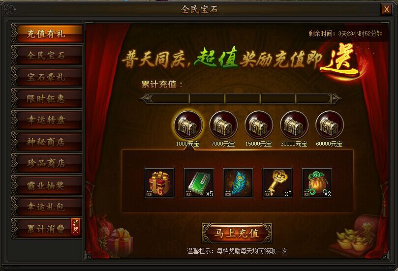 宝石竞技,豪礼相赠! 1. 充值有礼活动时间:2018年10月27日0点——10月30日23:59活动期间,充值元宝即可领取五档丰厚奖励,每天均可领取一次,不容错过! ...